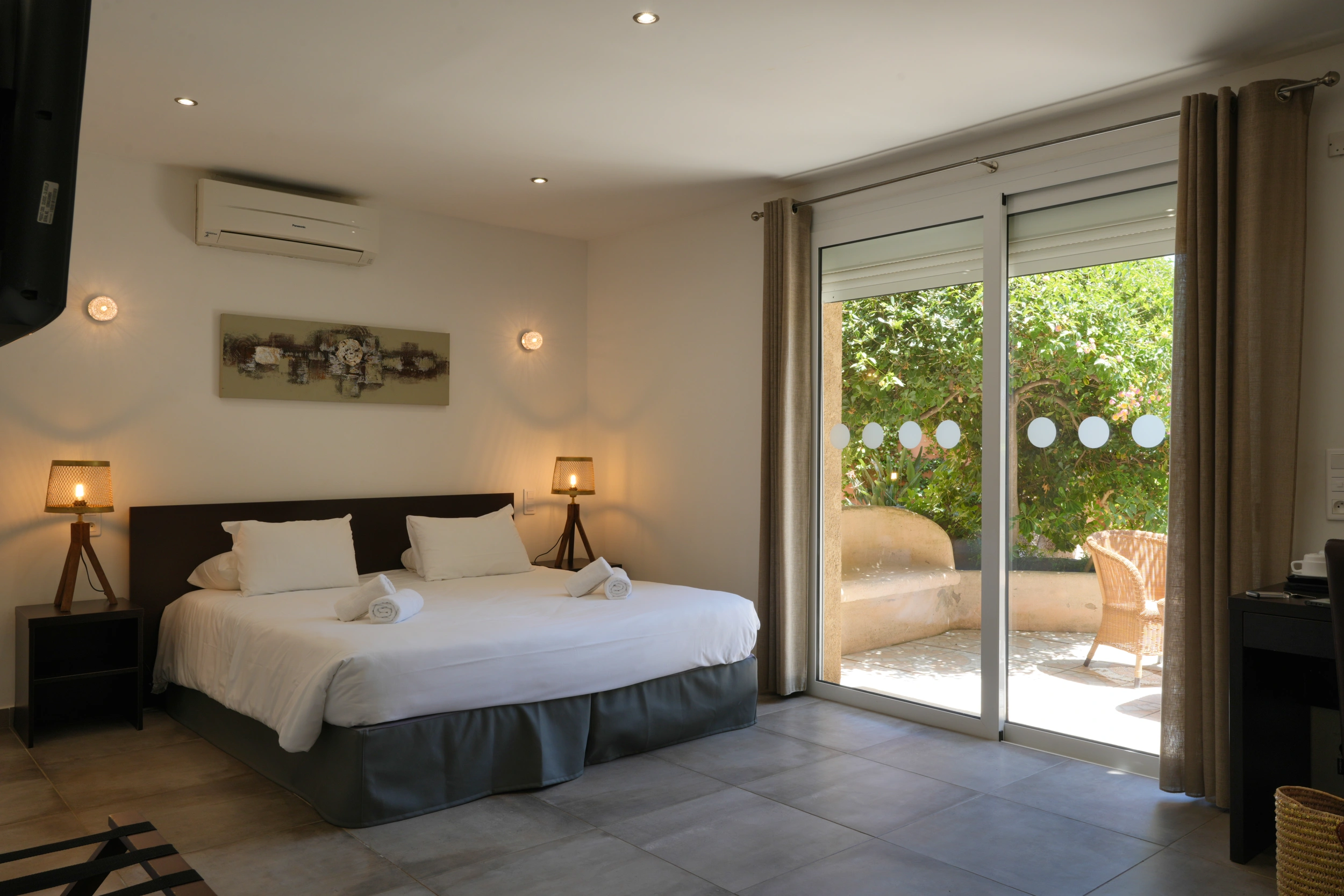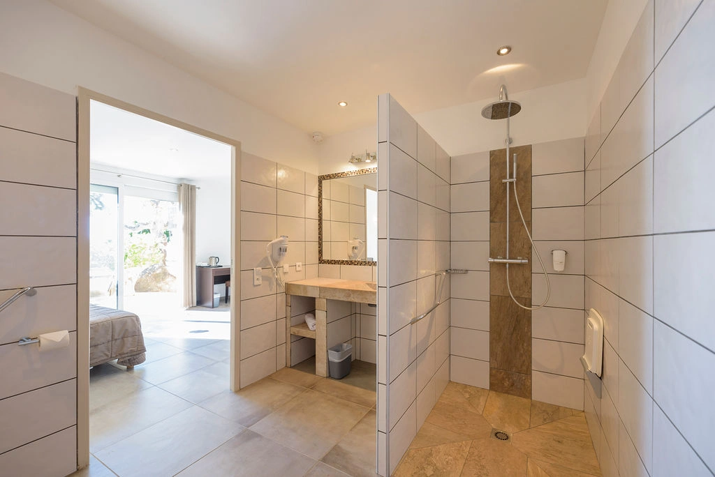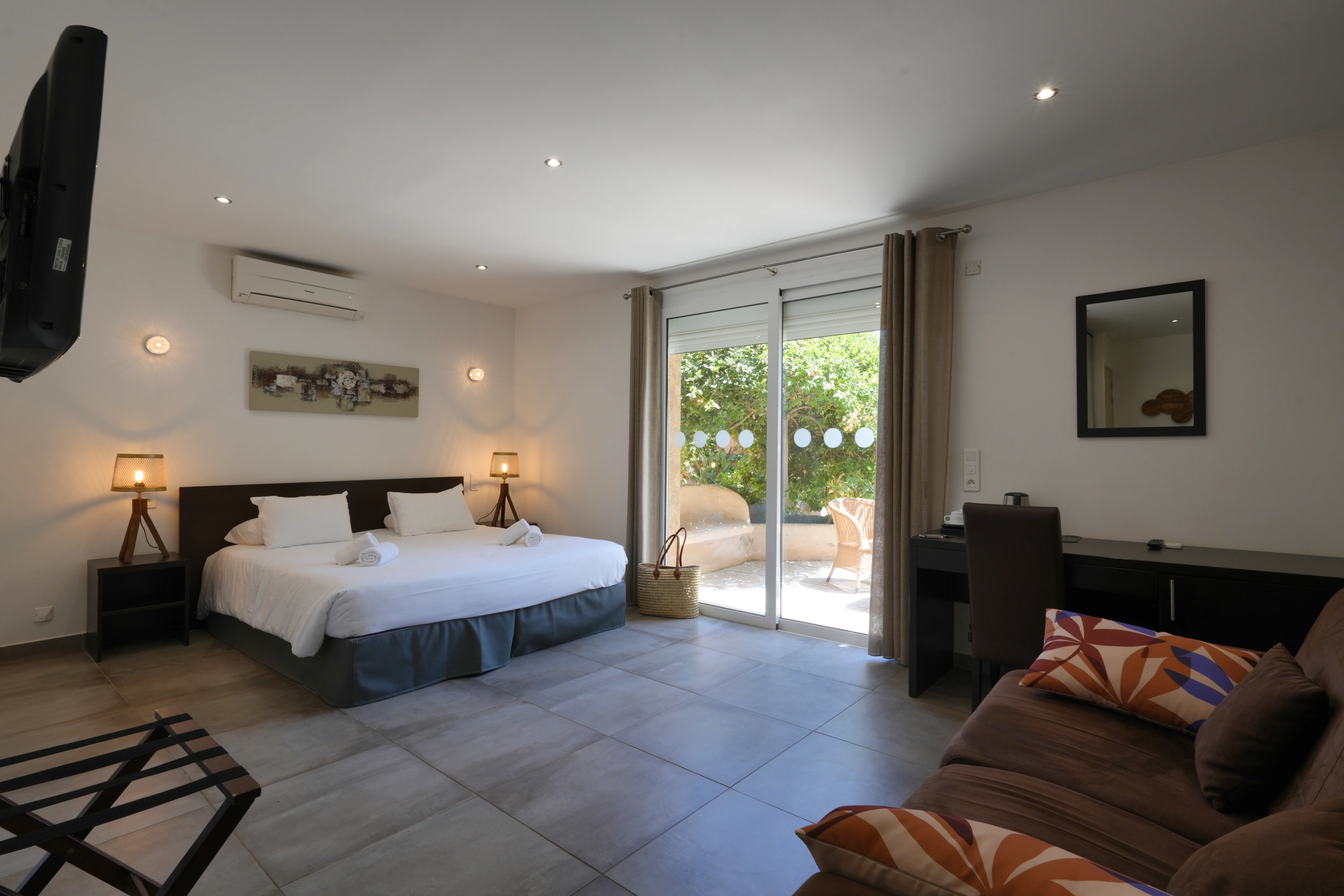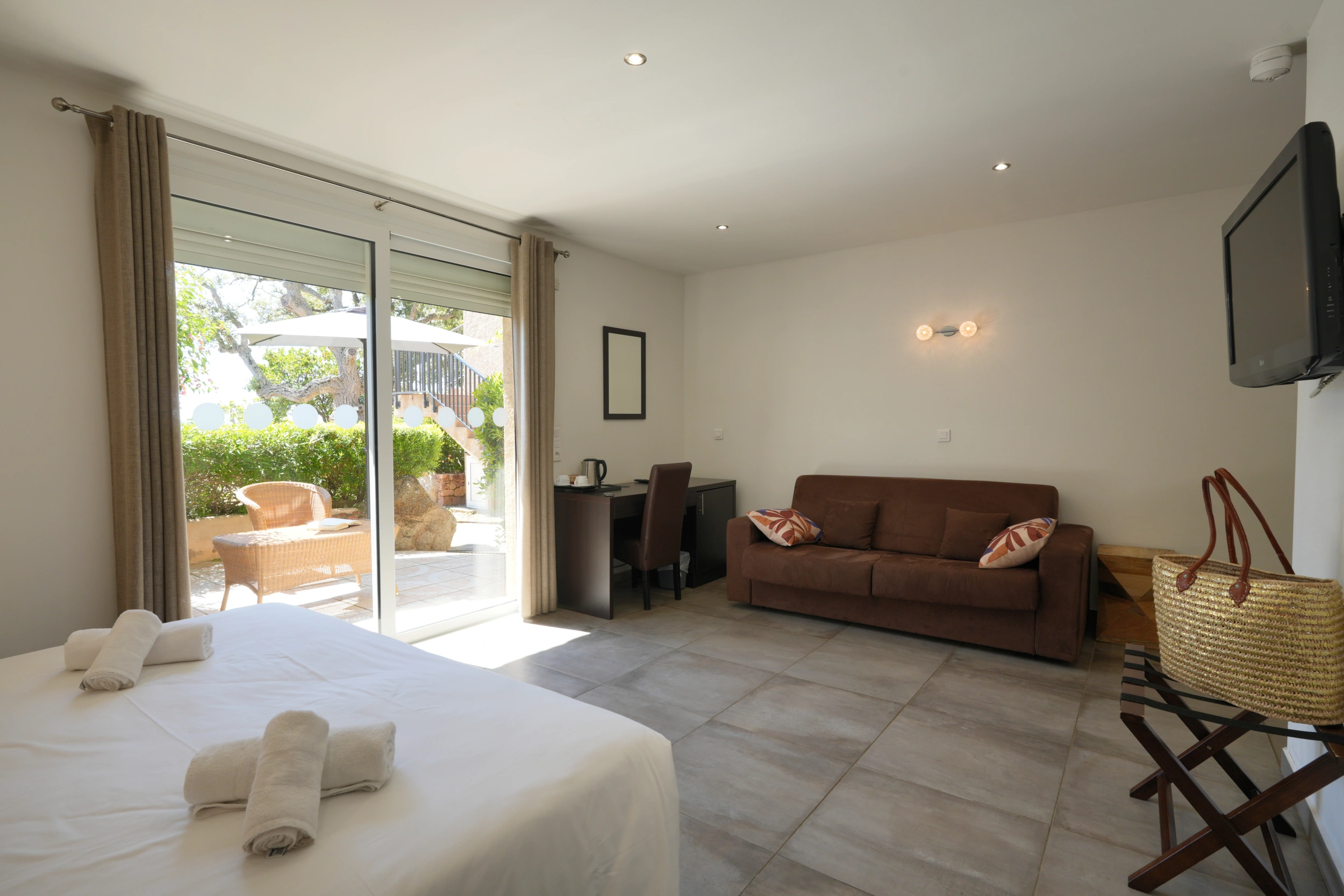 La chambre Supérieure, d’environ 25 m², est la plus spacieuse de l’hôtel et peut accueillir jusqu’à quatre personnes. Elle comprend un canapé convertible, une grande terrasse avec vue sur la mer et bénéficie d’un accès adapté aux personnes à mobilité réduite. Située en rez-de-chaussée, elle séduit les familles comme les voyageurs en quête d’espace et de confort. Climatisation, wifi, mini-frigo et autres équipements modernes sont inclus, avec possibilité d’ajouter un lit bébé sur demande.
