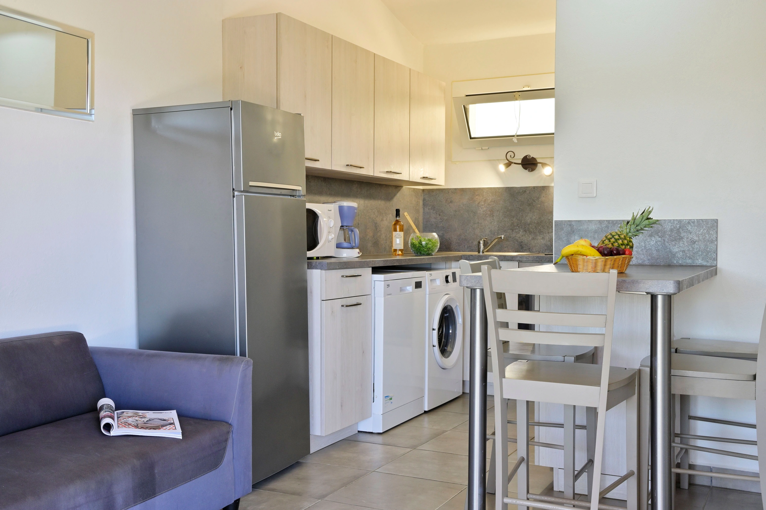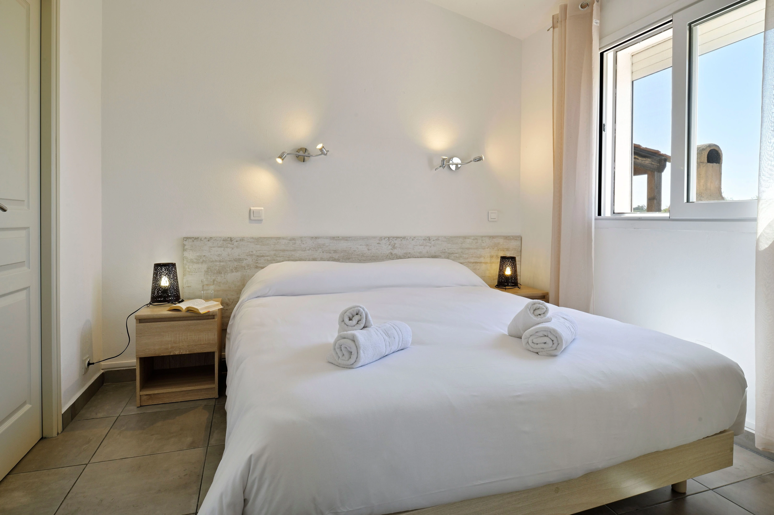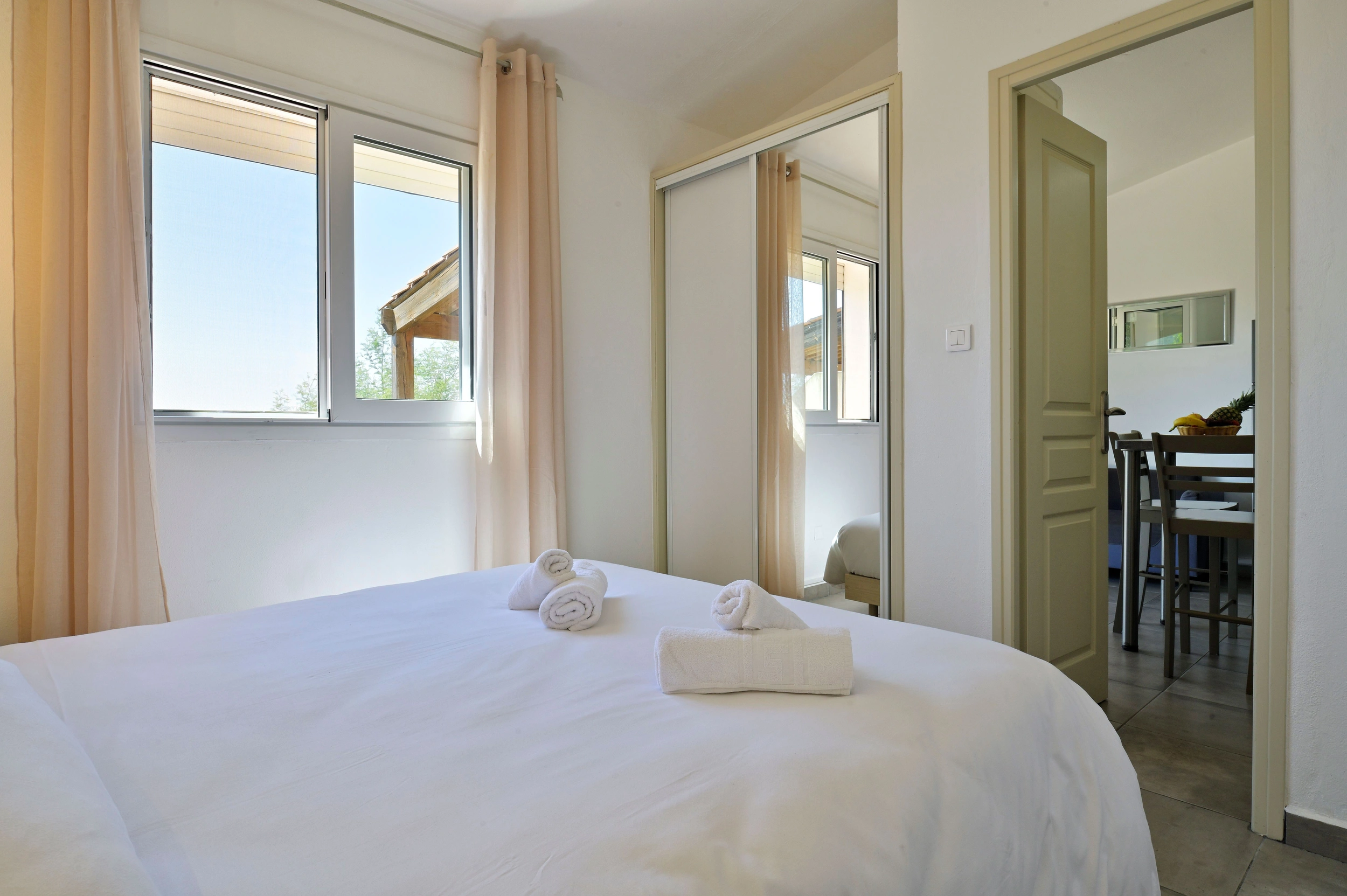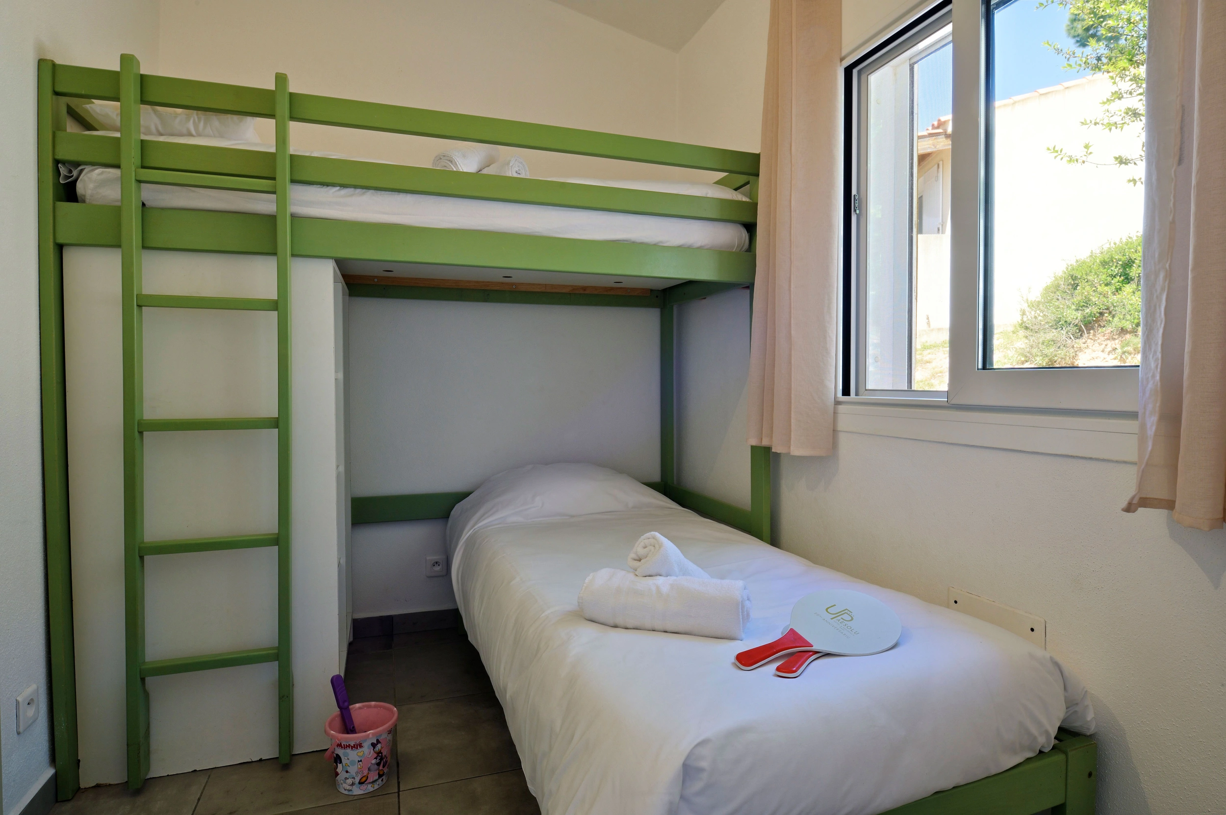 Capacité 4 personnes, surface de 30 à 35 m² : cette version de la mini-villa dispose d’une chambre double (lit en 160x200 cm) et d’une petite chambre avec deux lits superposés. Situées dans la partie haute du domaine, elles sont proche de la piscine et du restaurant, et bénéficient pour la plupart d’une vue mer. Idéales pour les familles avec enfants qui souhaitent profiter des commodités tout en étant légèrement isolées pour plus de calme.