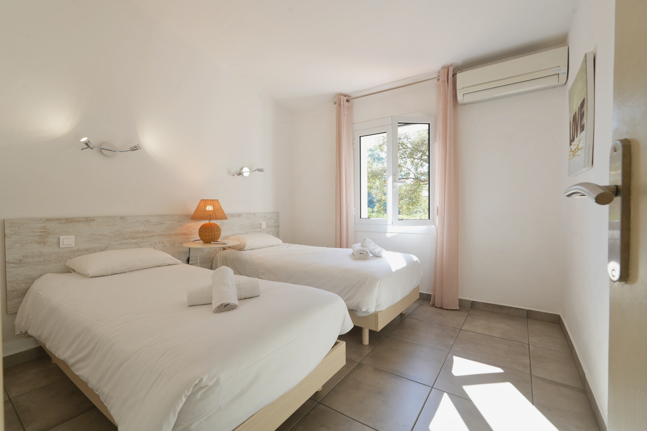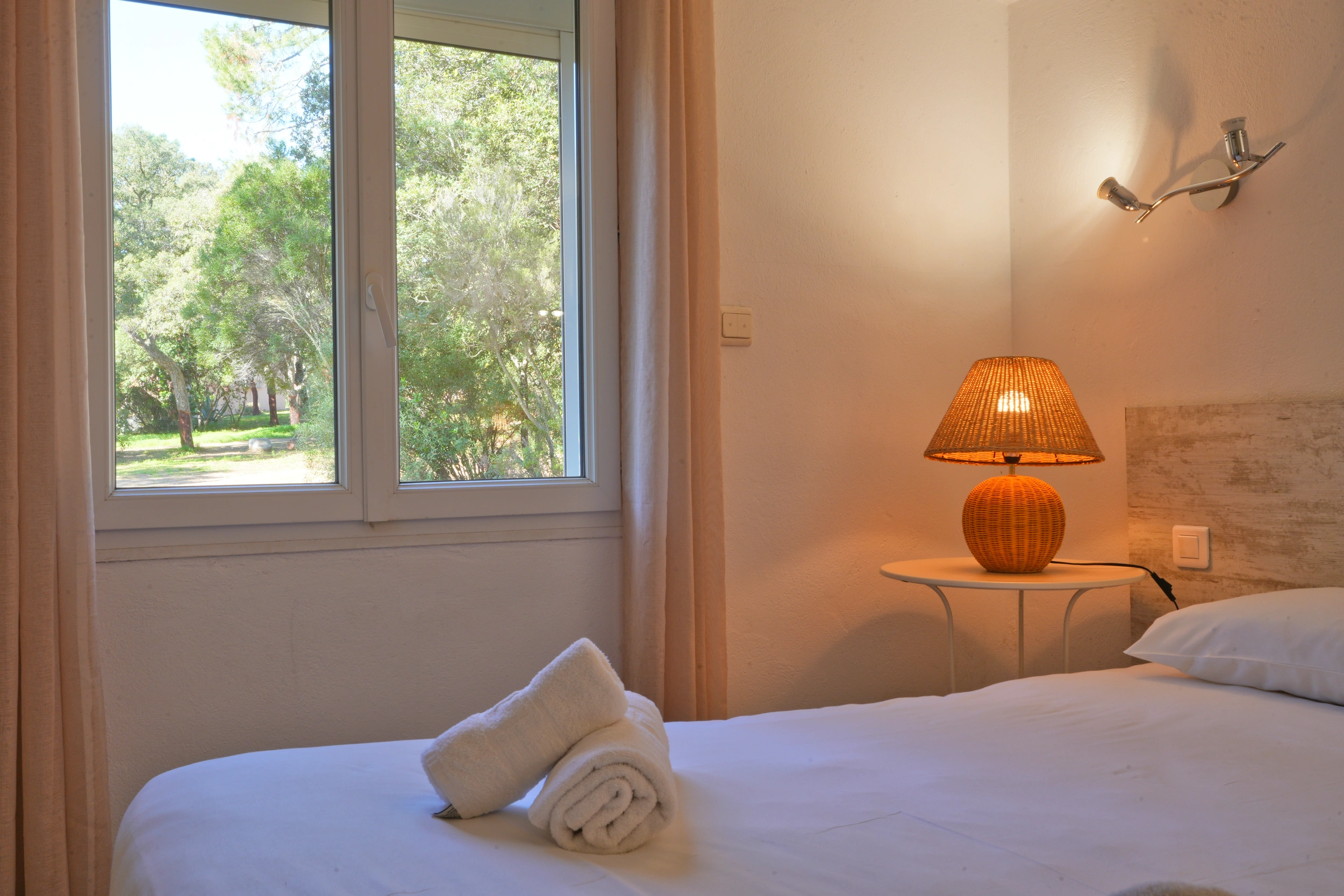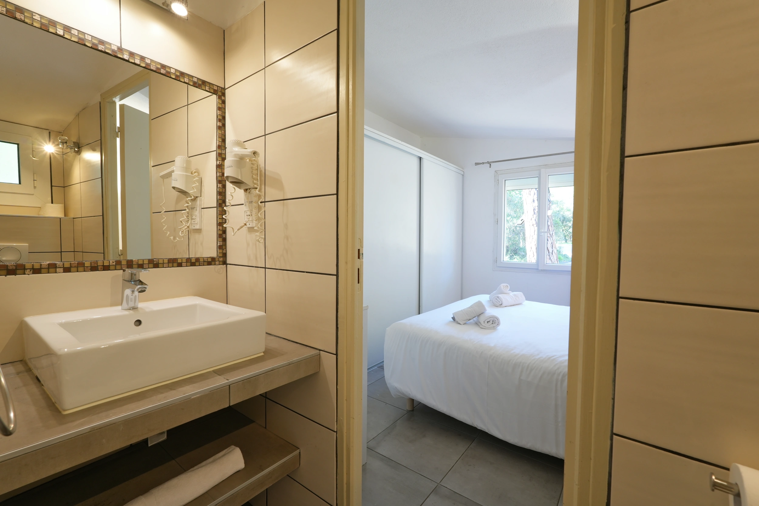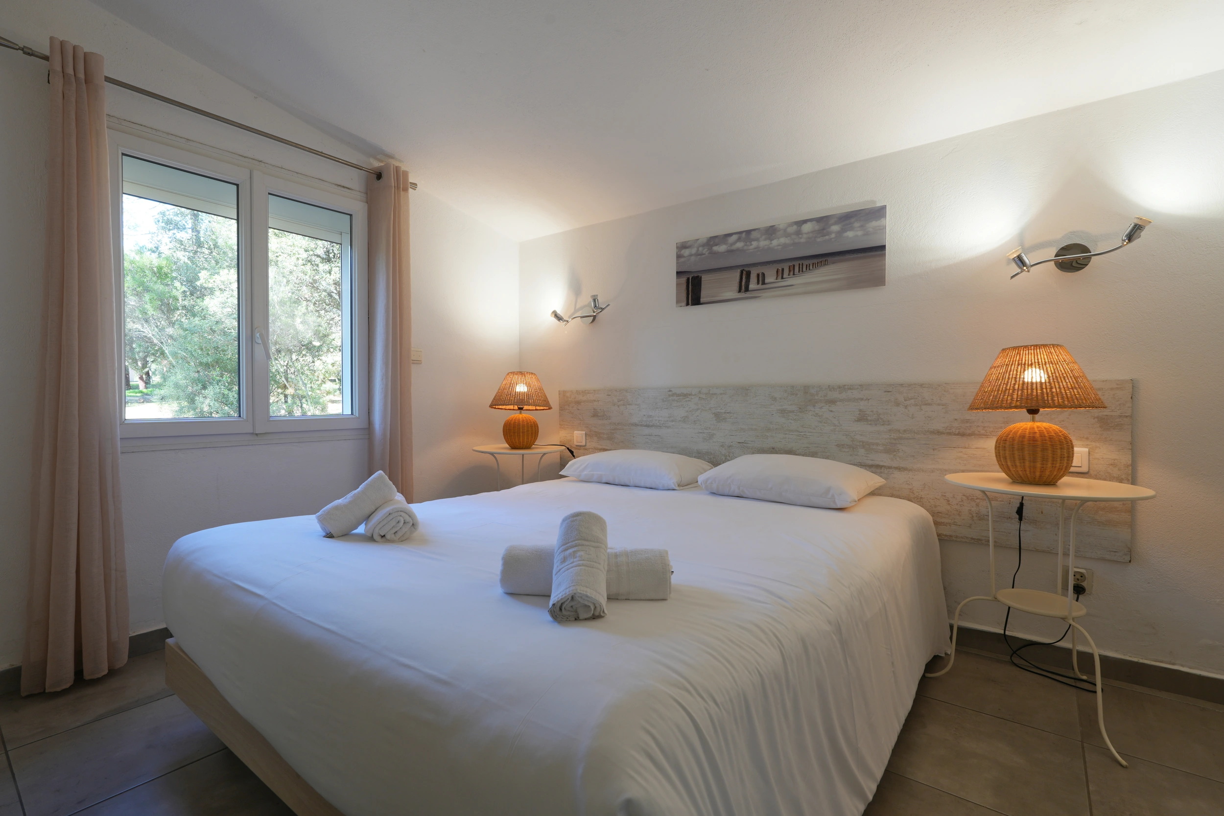 Pour les familles nombreuses ou les groupes d’amis, les mini-villas 3 chambres (environ 50 m²) situées au cœur de la pinède sont une excellente option. Elles disposent d’une chambre principale (lit en 160x200 cm) avec salle de bains privative, deux autres chambres avec deux lits simples (en 90 cm) rapprochables ou non, plus une salle de bains commune et un w.c. séparé. Climatisation, rangements, wifi inclus tout est pensé pour accueillir confortablement jusqu’à 6 personnes sans sacrifier l’intimité.