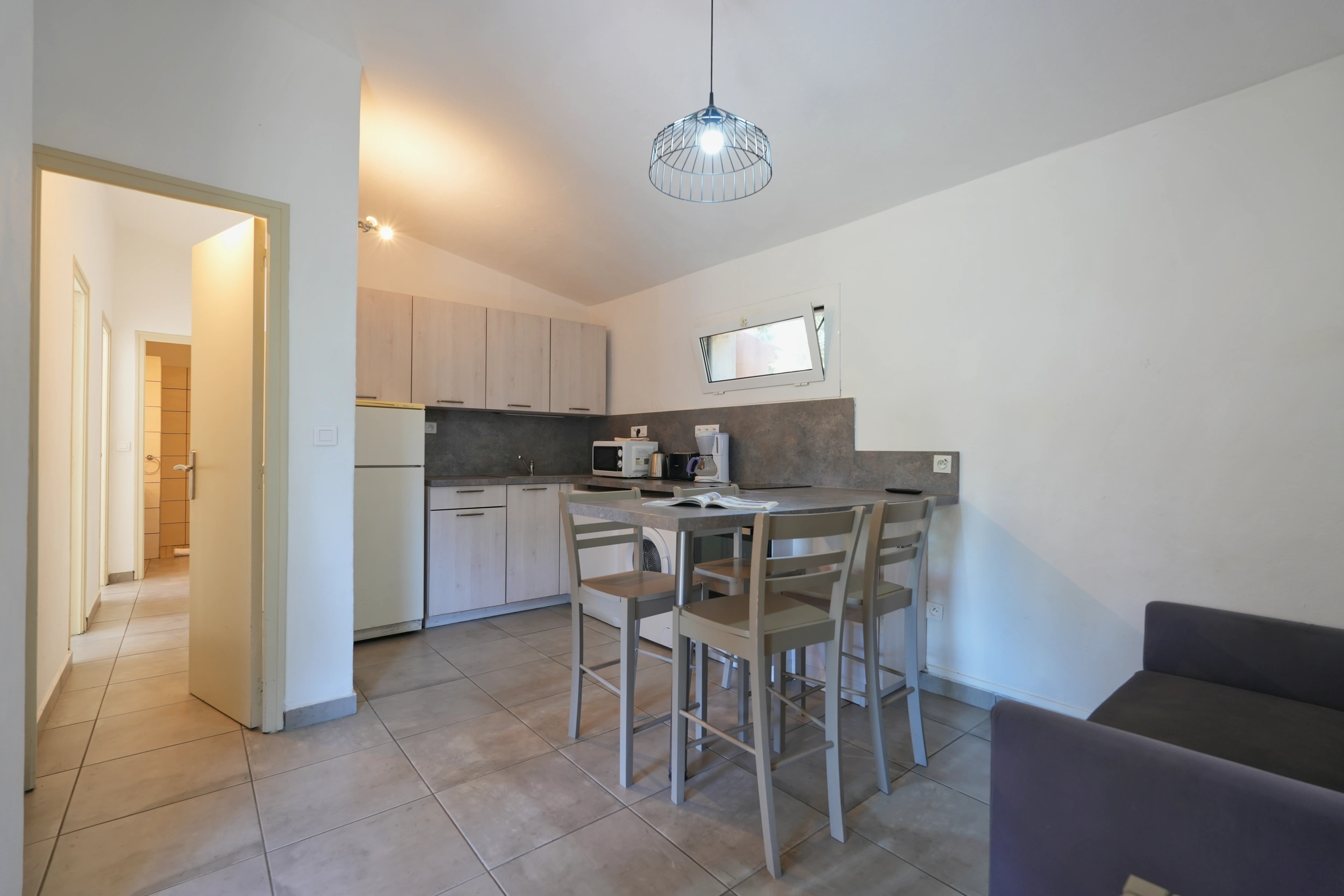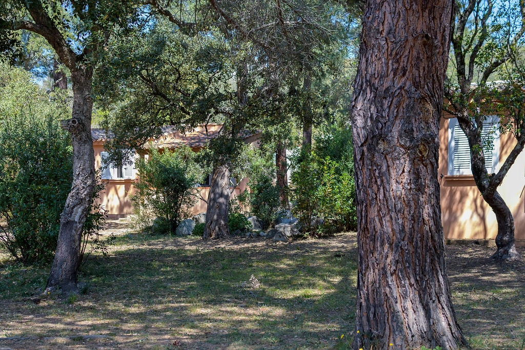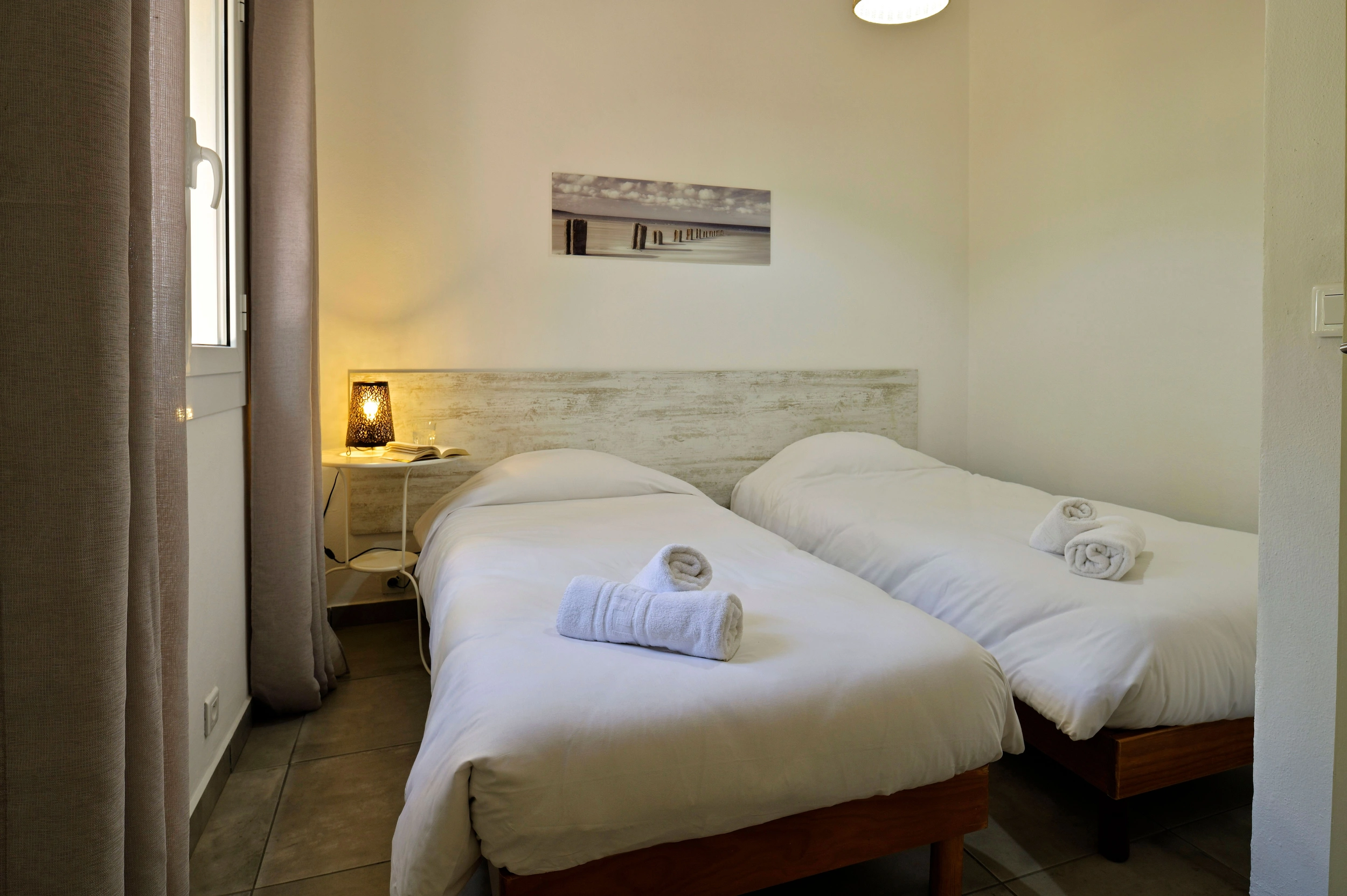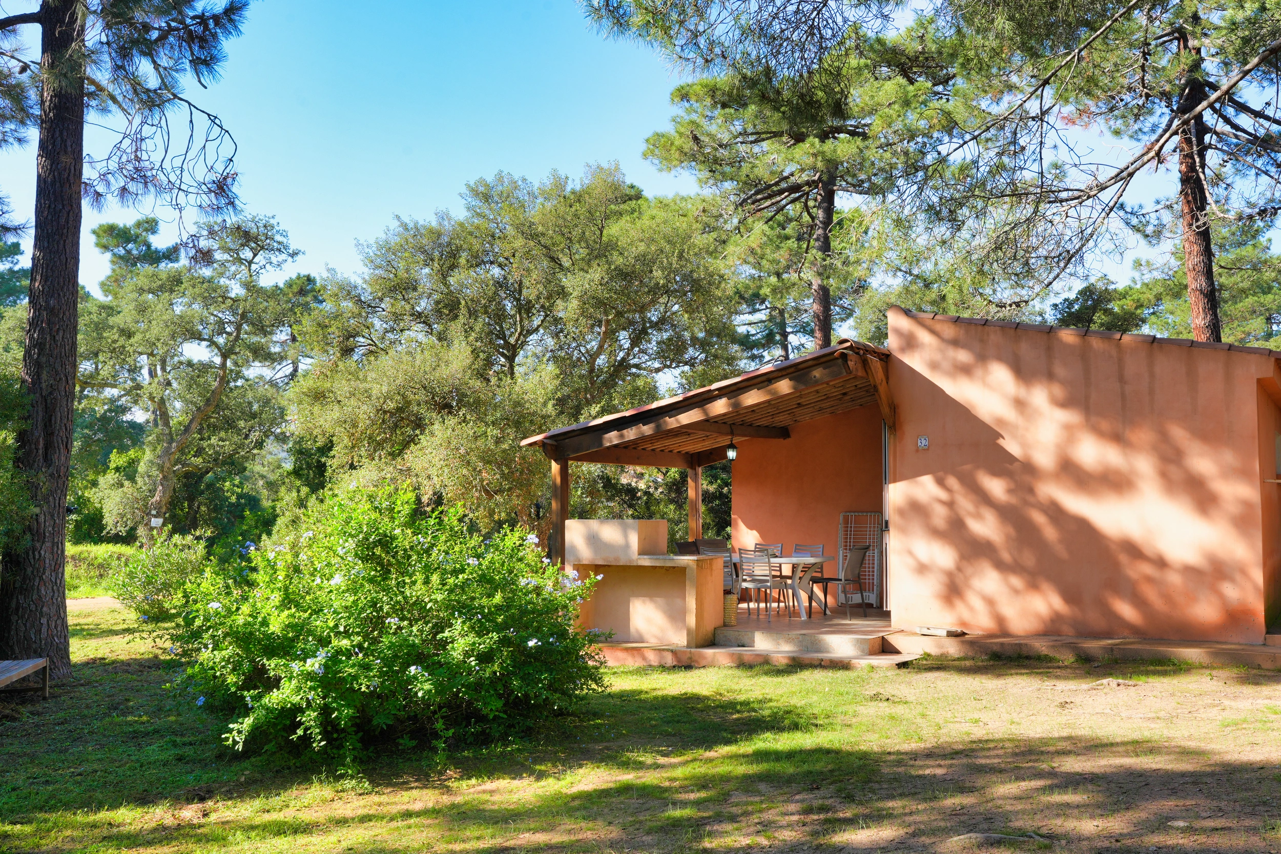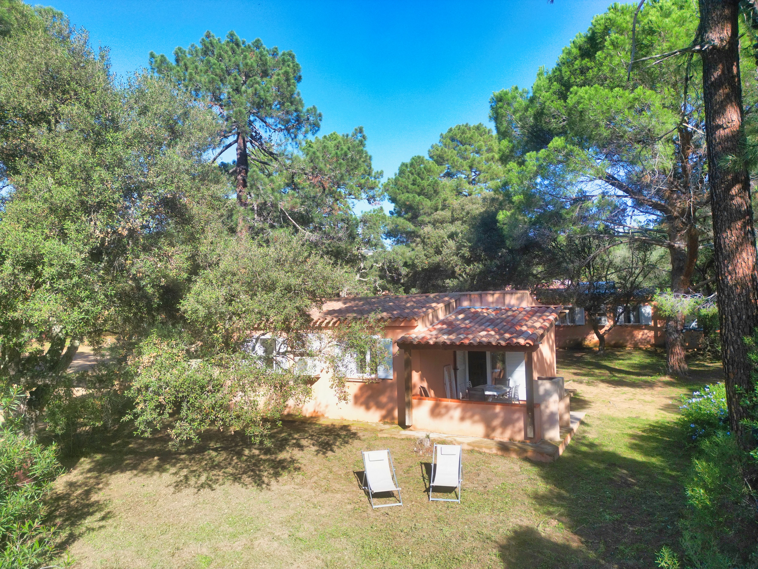 Pour les familles nombreuses ou les groupes d’amis, les mini-villas 3 chambres (environ 50 m²) situées au cœur de la pinède sont une excellente option. Elles disposent d’une chambre principale (lit en 160x200 cm) avec salle de bains privative, deux autres chambres avec deux lits simples (en 90 cm) rapprochables ou non, plus une salle de bains commune et un w.c. séparé. Climatisation, rangements, wifi inclus tout est pensé pour accueillir confortablement jusqu’à 6 personnes sans sacrifier l’intimité.