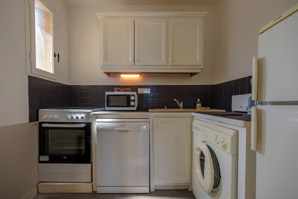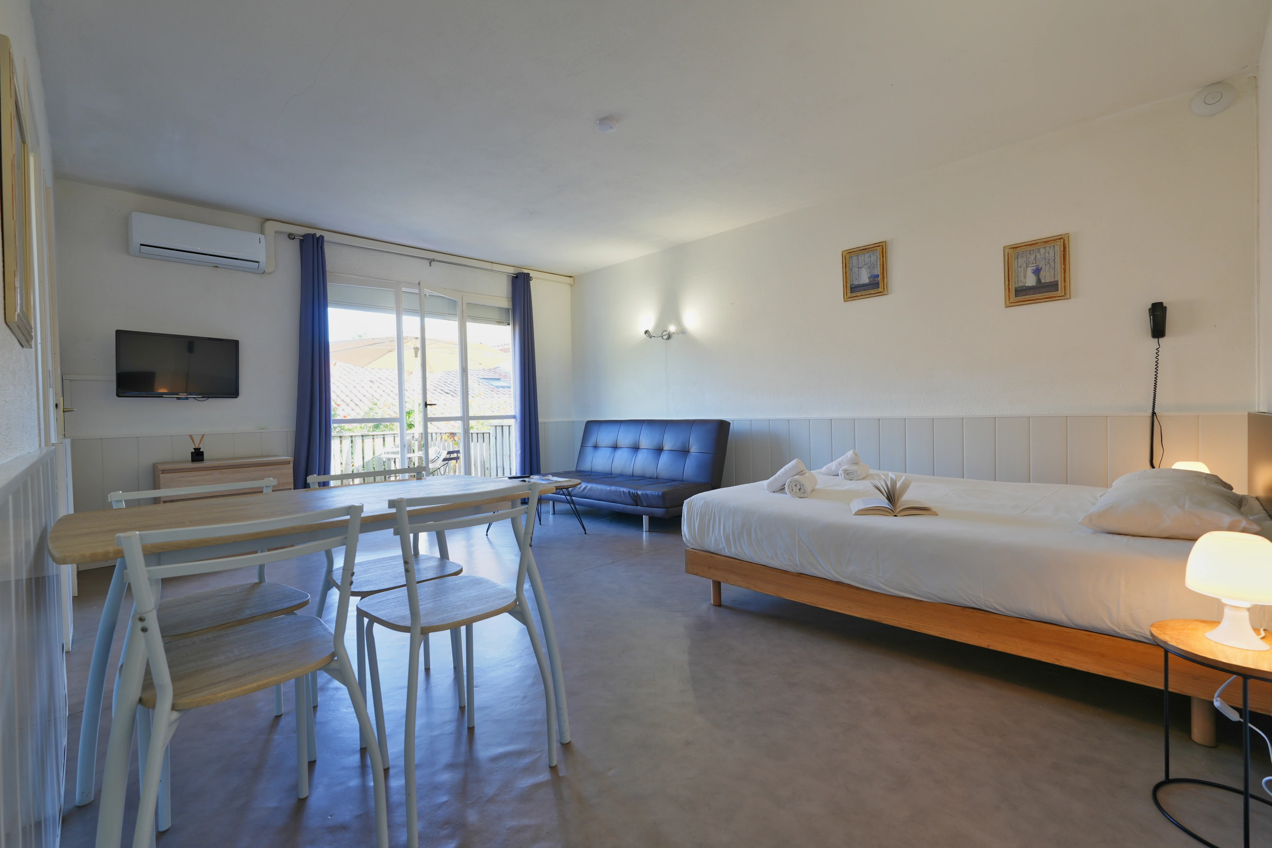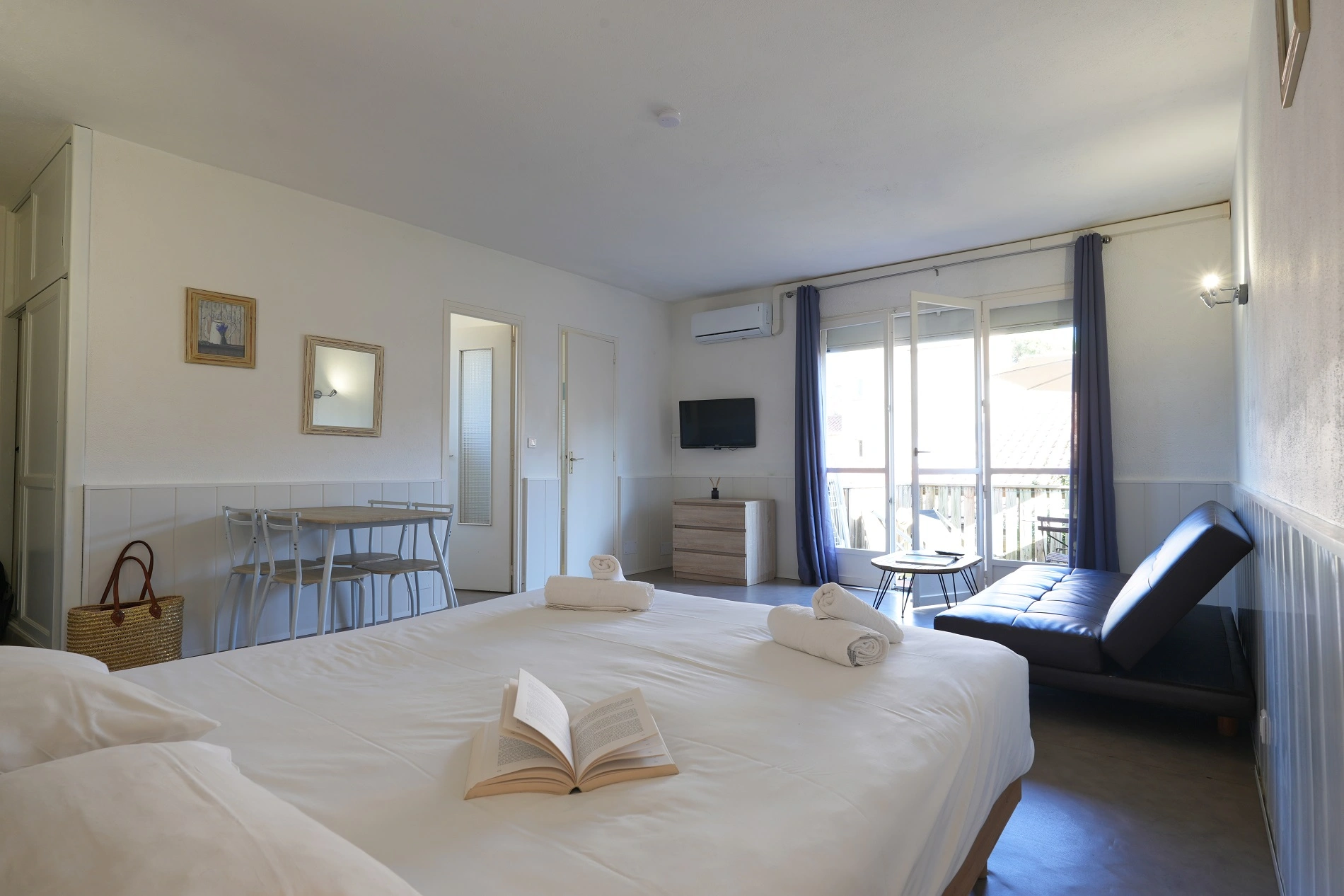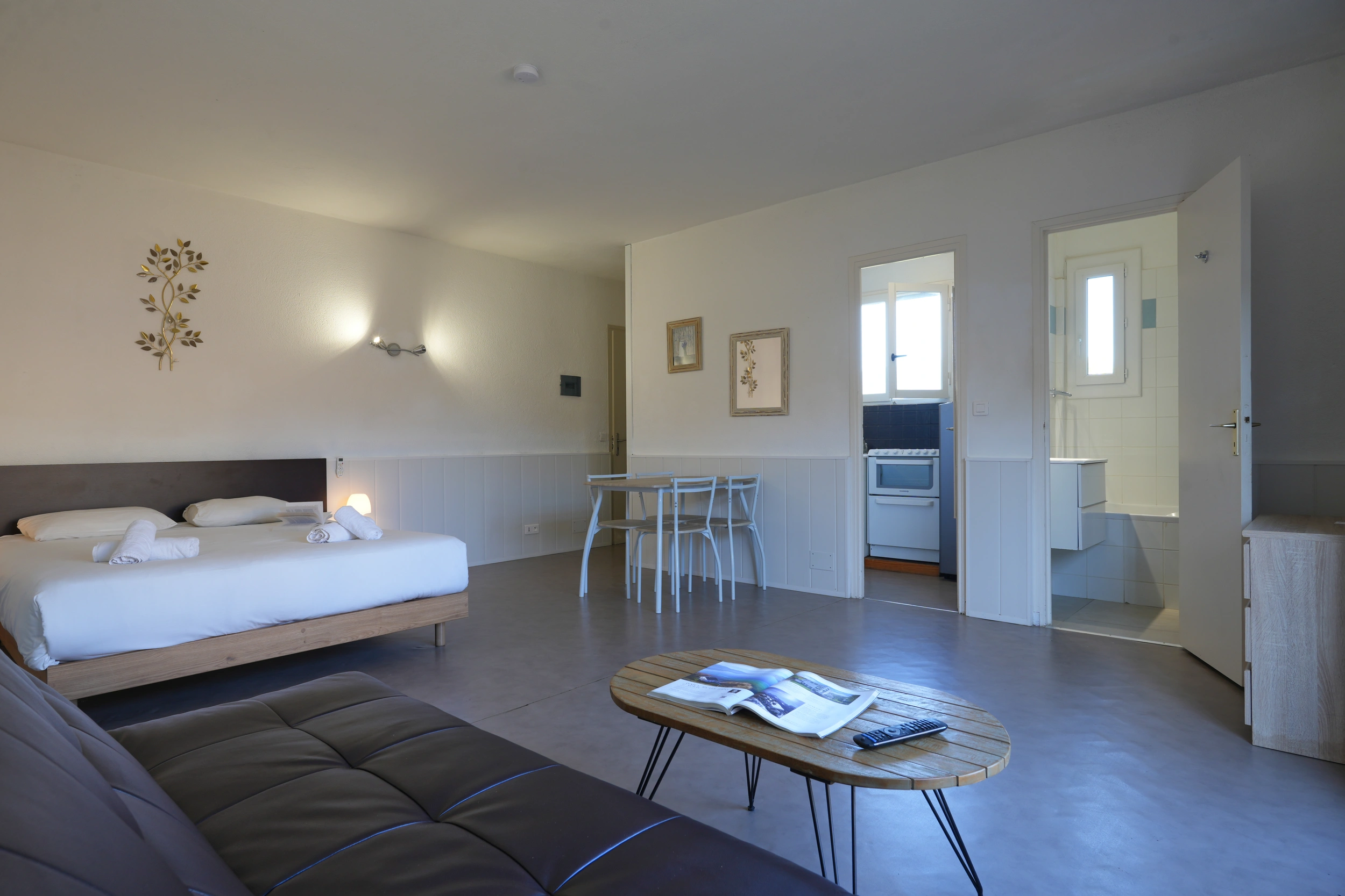 Le studio « Simple », d’environ 25 m², est parfait pour 2 personnes. Il propose un lit double (160 ou 180 cm) ou deux lits simples (90 cm) modulables, une cuisine équipée et un espace repas. Une salle de bains avec douche et sèche-cheveux complètent le logement. Terrasse en rez-de-chaussée ou balcon en étage pour profiter de l’extérieur. Idéal pour un couple ou un séjour en toute simplicité, à deux pas de la piscine et de la plage de Pinarello.