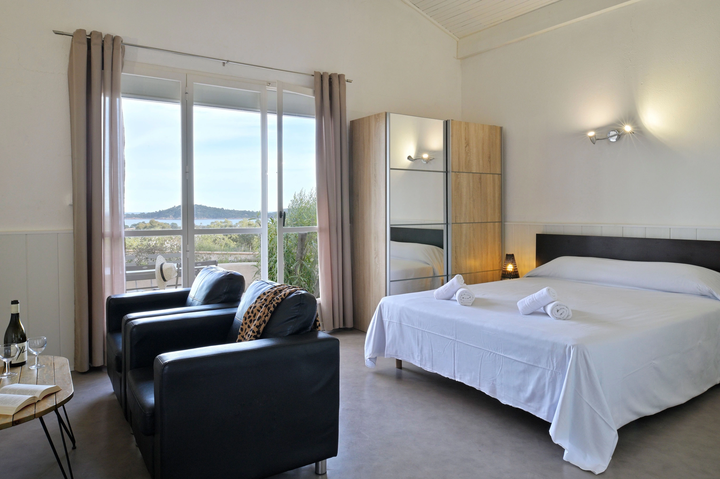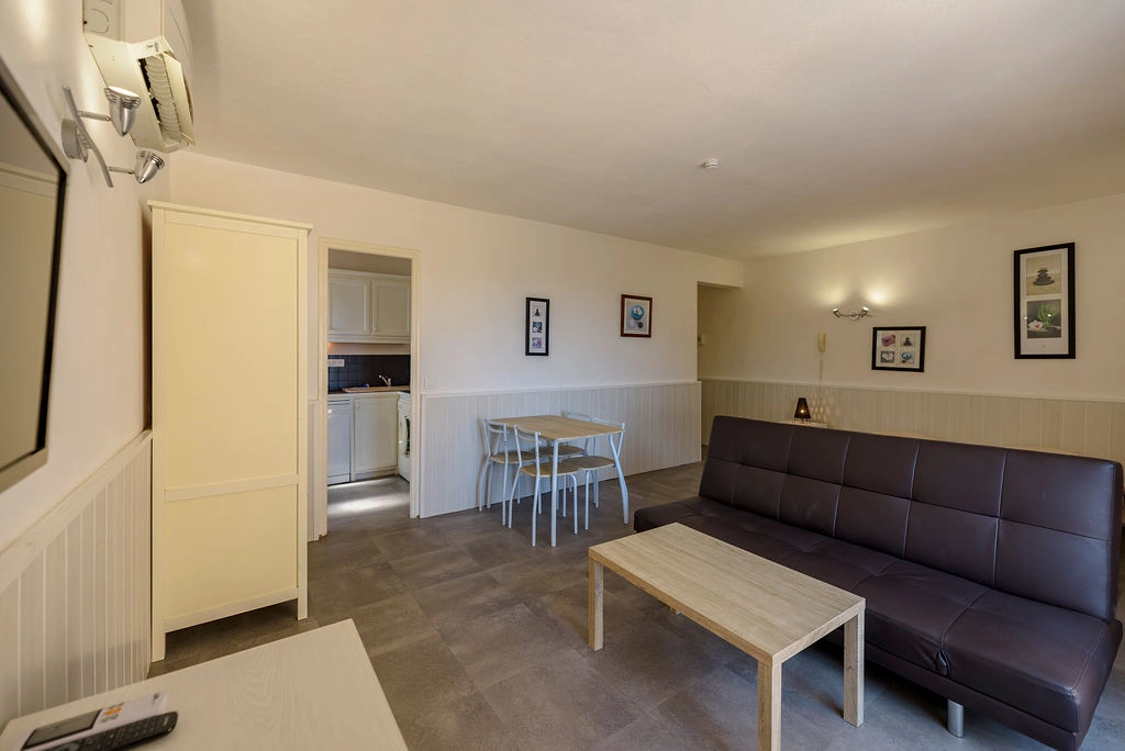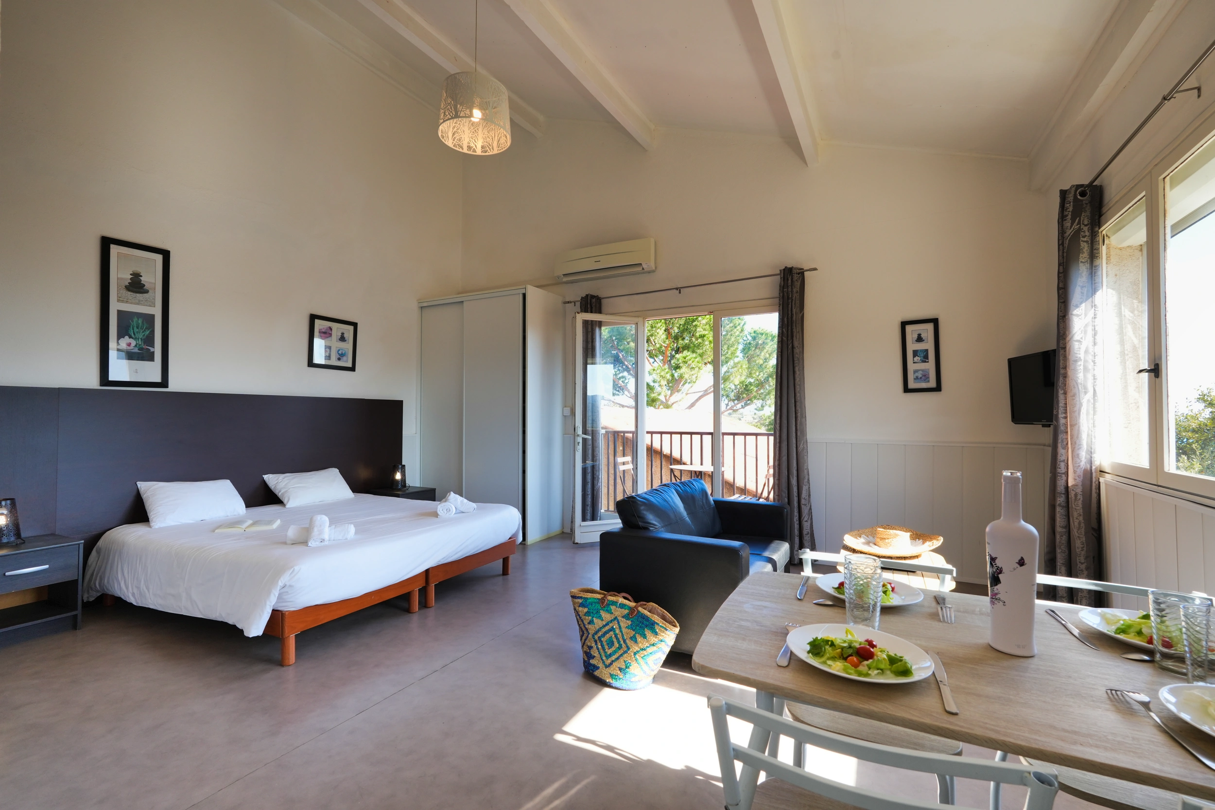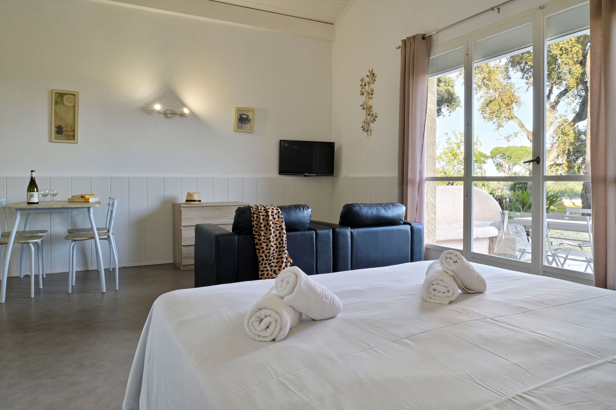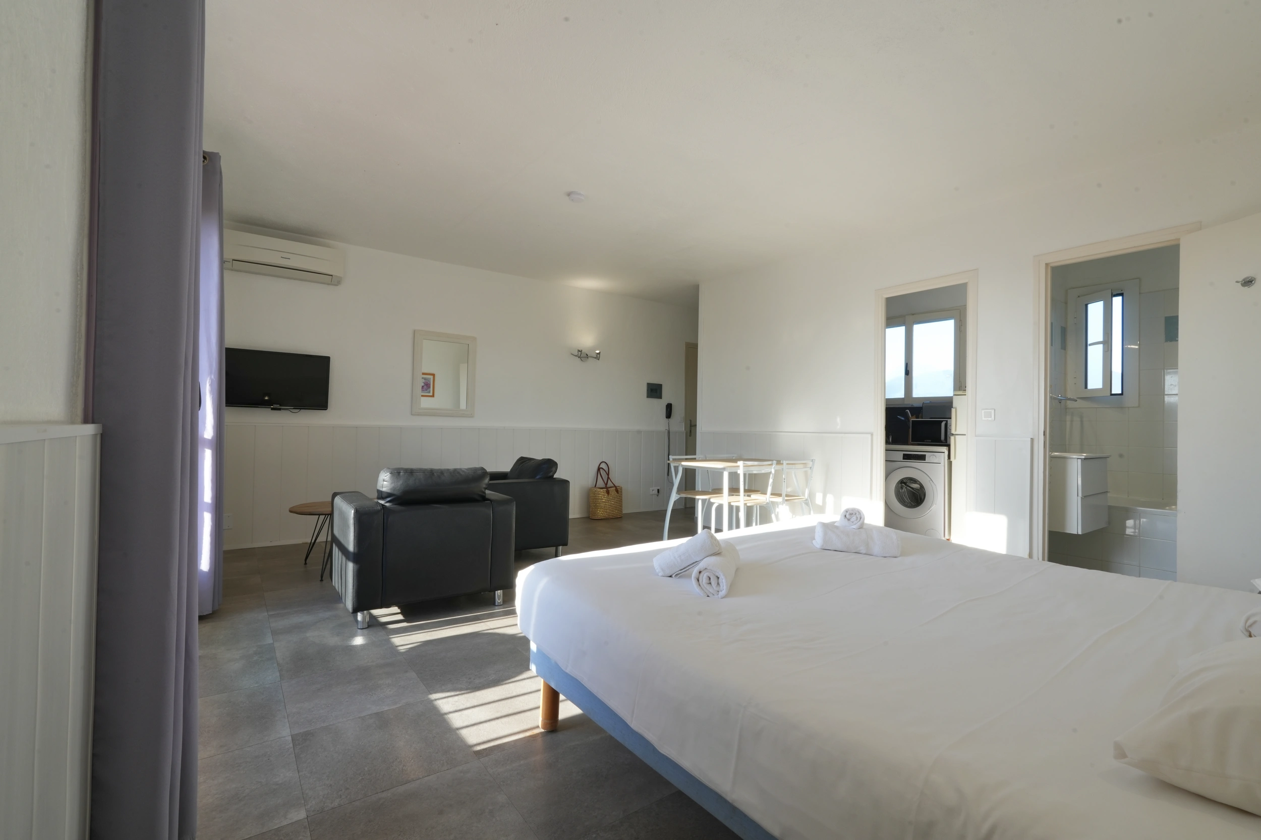 Le studio « Simple » vue mer, d’environ 25 m², est parfait pour 2 personnes. Il propose un lit double (160 ou 180 cm) ou deux lits simples (90 cm) modulables, une cuisine équipée et un espace repas. Une salle de bains avec douche et sèche-cheveux complète le logement. Terrasse en rez-de-chaussée ou balcon en étage pour profiter de l’extérieur et de la vue mer. Idéal pour un couple ou un séjour en toute simplicité, à deux pas de la piscine et de la plage de Pinarello.
