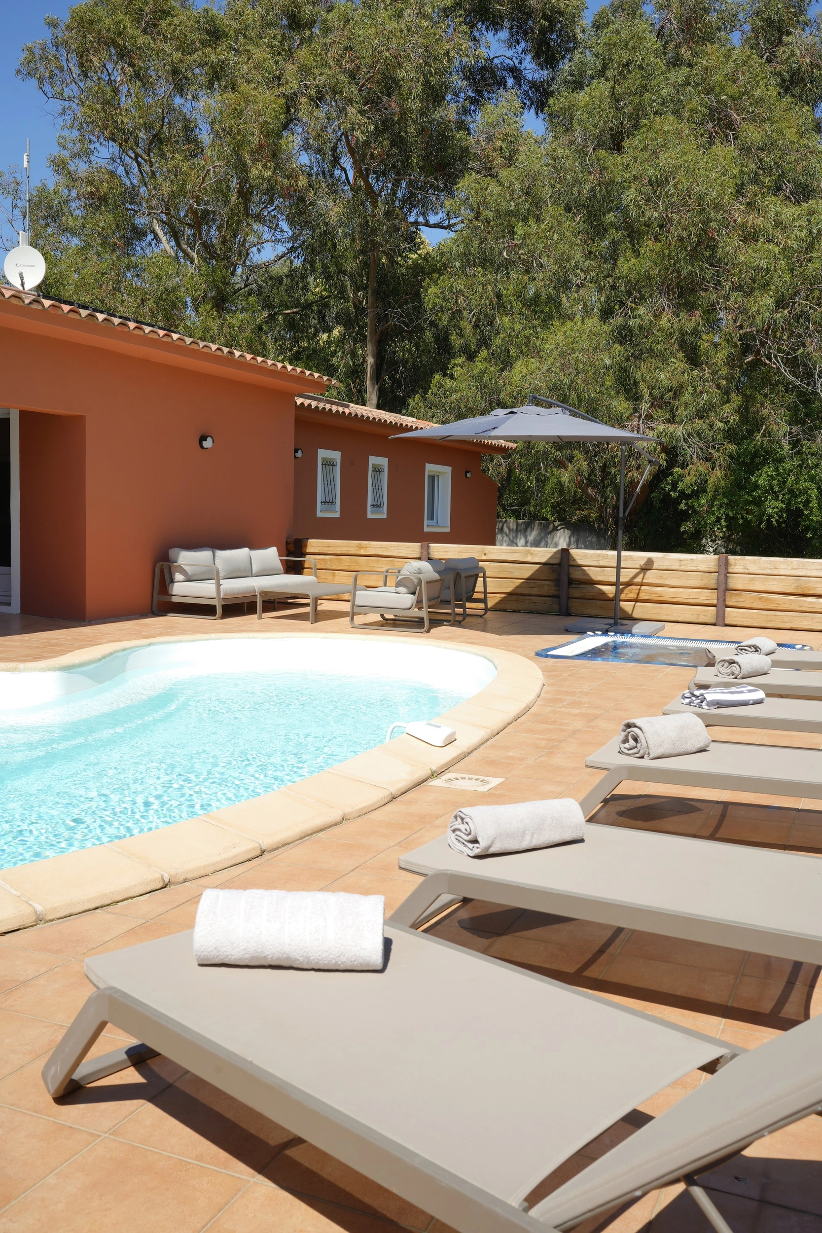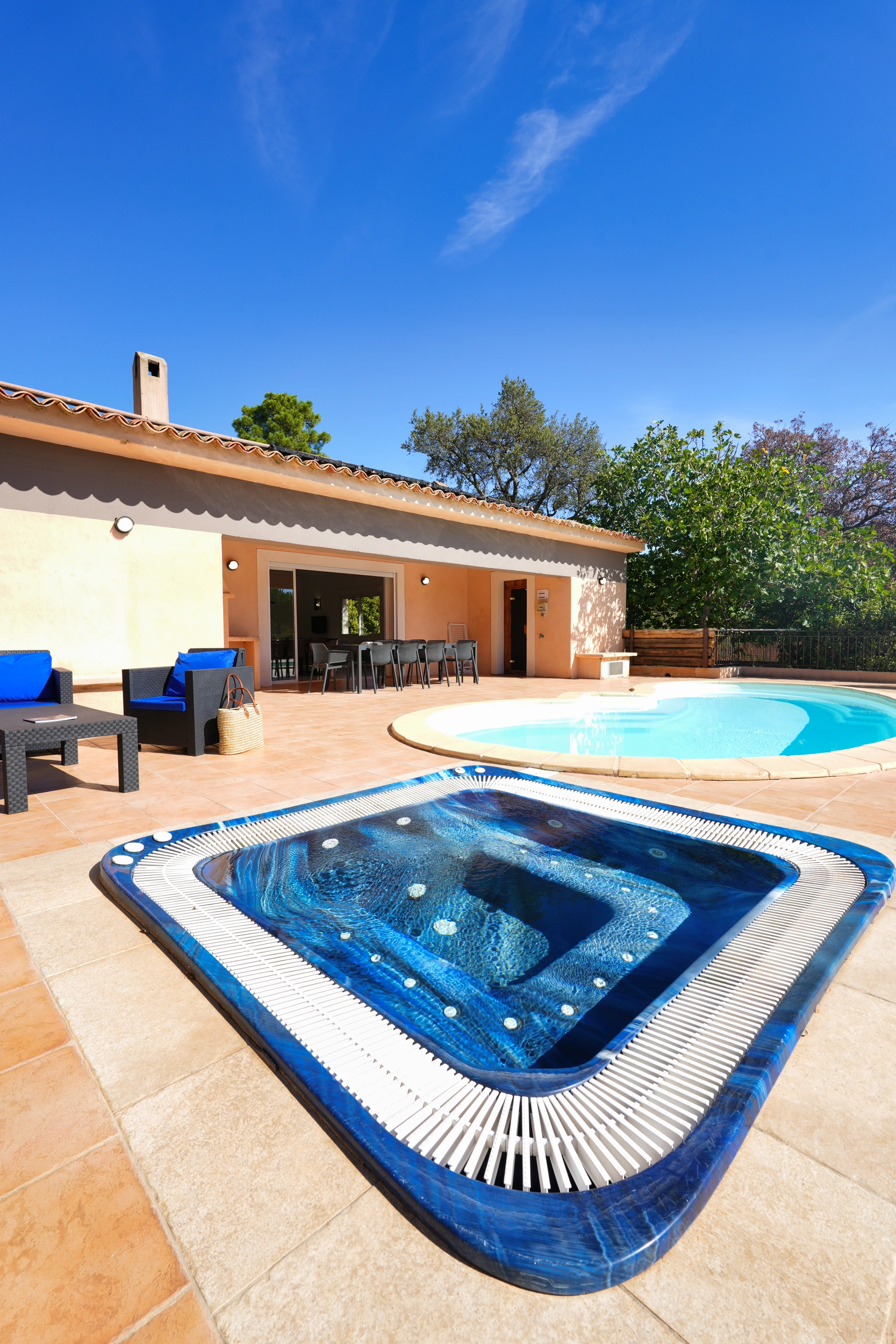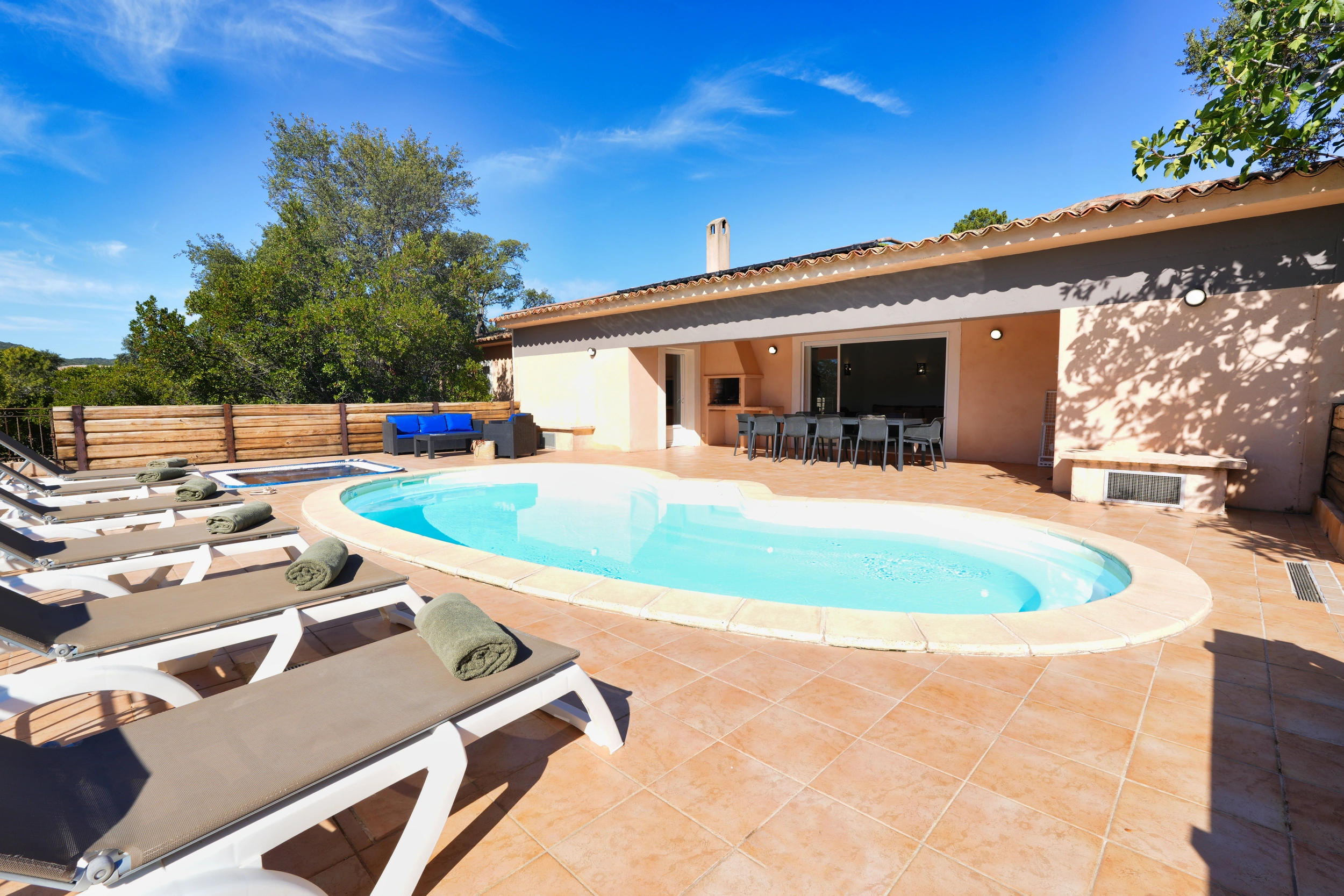 Les villas Privilège représentent un haut niveau de confort, avec 4 chambres et la capacité d’accueillir 8 personnes. Chaque chambre dispose de sa salle de bains privative pour un confort optimal, un jardin spacieux, une piscine chauffée ainsi qu'un sauna et un jacuzzi apportent la touche finale. Idéales pour les grandes familles ou les groupes, elles offrent un cadre raffiné et une atmosphère intime où partager des moments uniques que ce soit sur la terrasse équipée d'un barbecue ou en profitant du salon de jardin au bord de la piscine. Cette villa dispose d’un accès PMR.