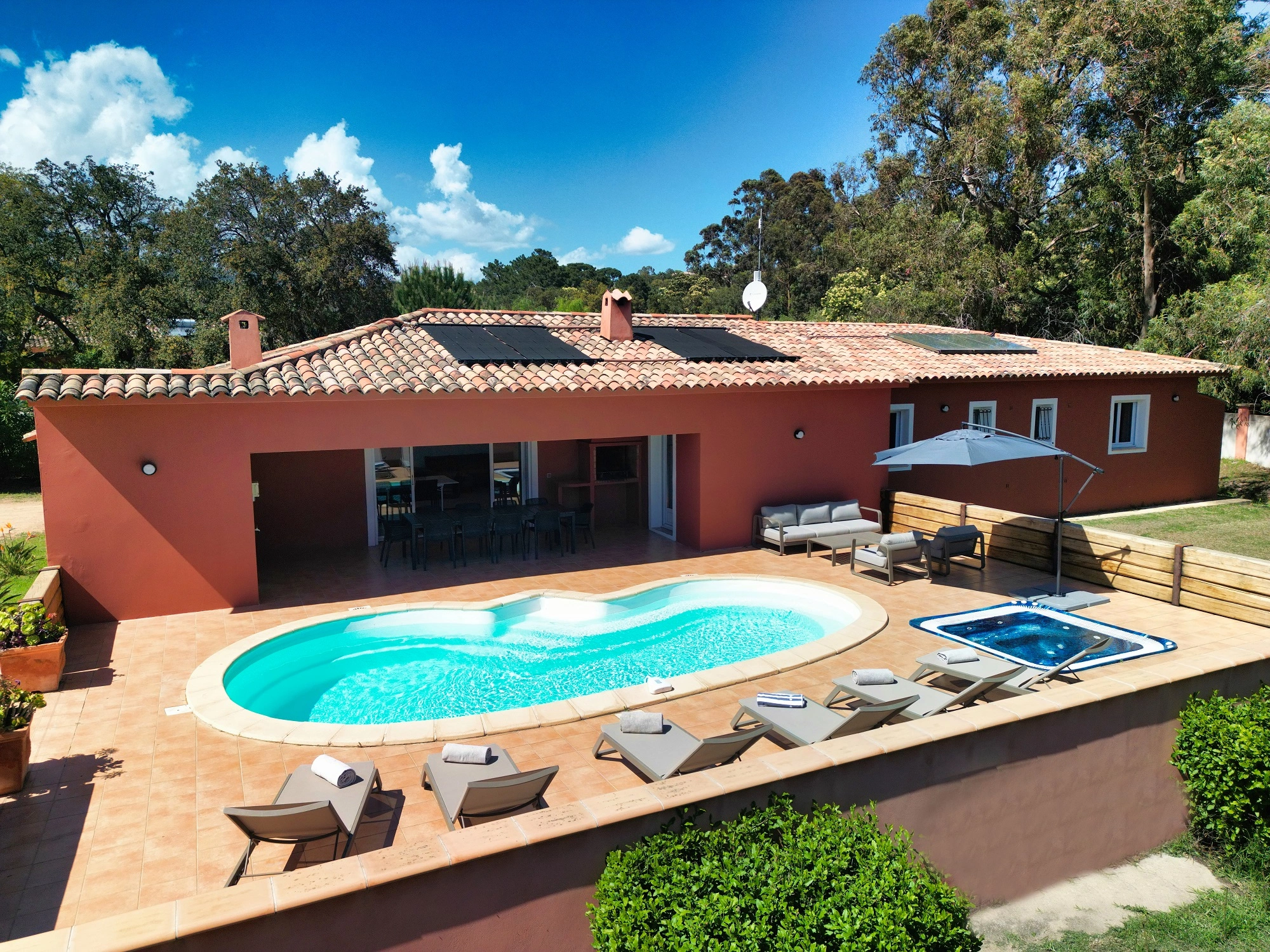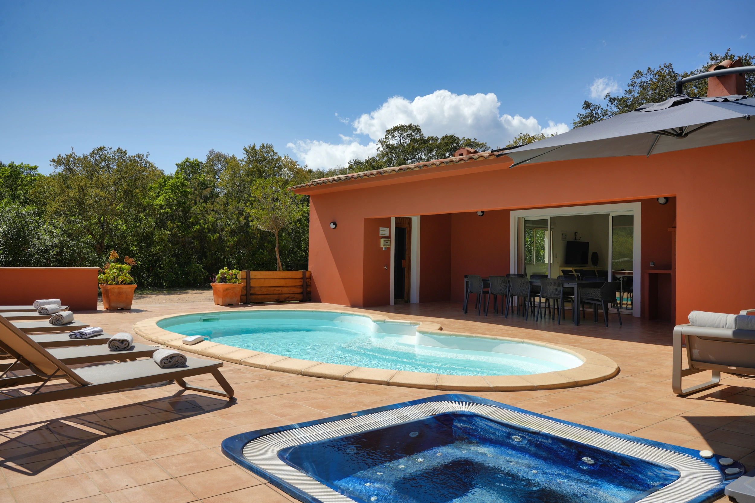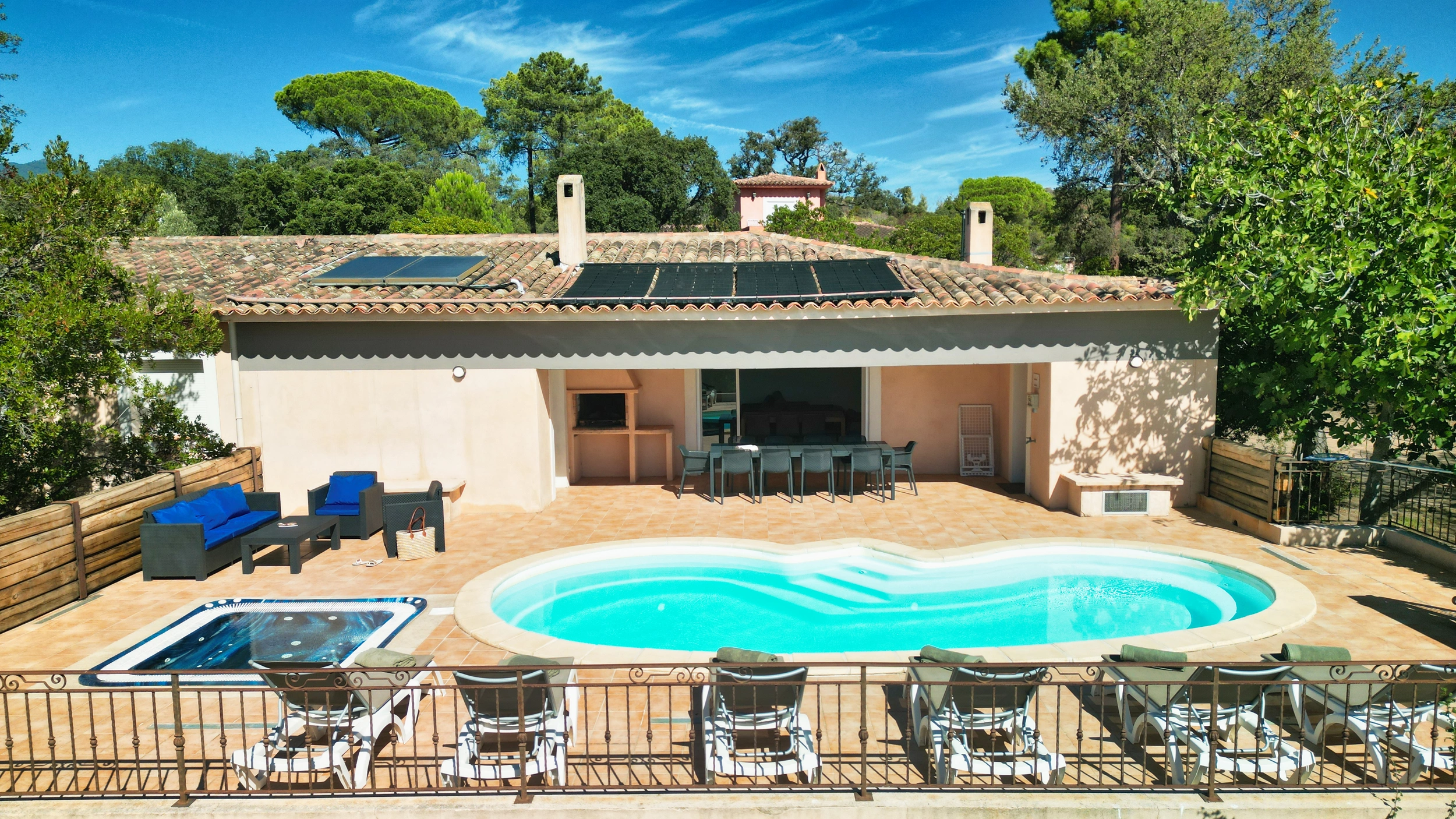 Les villas Privilège représentent un haut niveau de confort, avec 4 chambres et la capacité d’accueillir 8 personnes. Chaque chambre dispose de sa salle de bains privative pour un confort optimal, un jardin spacieux, une piscine chauffée ainsi qu'un sauna et un jacuzzi apportent la touche finale. Idéales pour les grandes familles ou les groupes, elles offrent un cadre raffiné et une atmosphère intime où partager des moments uniques que ce soit sur la terrasse équipée d'un barbecue ou en profitant du salon de jardin au bord de la piscine. Cette villa dispose d’un accès PMR.